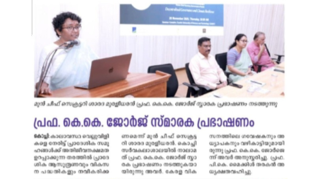കാലാവസ്ഥ വെല്ലുവിളികളെ നേരിട്ട് പ്രാദേശിക സമൂഹങ്ങൾക്ക് അതിജീവനക്ഷമത ഉറപ്പാക്കുന്ന തരത്തിൽ പ്രാദേശിക ആസൂത്രണവും വികസന പദ്ധതികളും നവീകരിക്കണമെന്ന് മുൻ ചീഫ് സെക്രട്ടറി ശാരദ മുരളീധരൻ. കൊച്ചി സർവകലാശാലയിൽ നാലാമത് പ്രഫ. കെ. കെ. ജോർജ് സ്മാരക പ്രഭാഷണം നടത്തുകയായിരുന്നു അവർ. കേരള വികസനത്തിലെ ഗവേഷകനും അധ്യാപകനും വഴികാട്ടിയുമായിരുന്നു പ്രഫ. കെ. കെ. ജോർജെന്ന് അവർ അനുസ്മരിച്ചു. പ്രഫ. പി.കെ. മൈക്കിൾ തരകൻ അധ്യക്ഷത വഹിച്ചു.