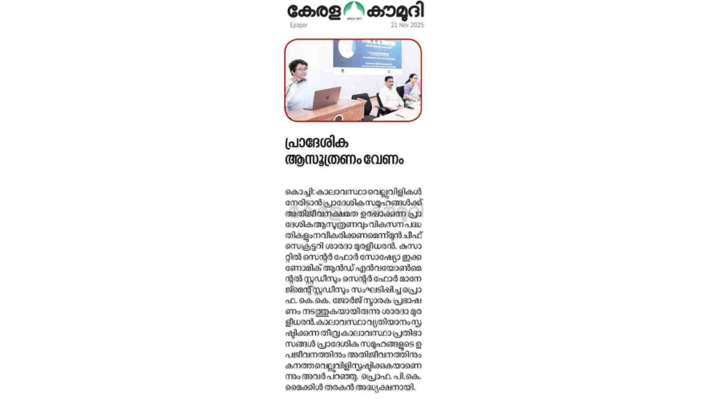കാലാവസ്ഥാ വെല്ലുവിളികൾ നേരിടാൻ പ്രാദേശിക സമൂഹങ്ങൾക്ക് അതിജീവനക്ഷമത ഉറപ്പാക്കുന്ന പ്രാദേശിക ആസൂത്രണവും വികസന പദ്ധതികളും നവീകരിക്കണമെന്ന് മുൻ ചീഫ് സെക്രട്ടറി ശാരദാ മുരളീധരൻ. കുസാറ്റിൽ സെൻ്റർ ഫോർ സോഷ്യോ ഇക്കണോമിക് ആൻഡ് എൻവയോൺമെന്റൽ സ്റ്റഡീസും സെൻ്റർ ഫോർ മാനേജ്മെന്റ് സ്റ്റഡീസും സംഘടിപ്പിച്ച പ്രൊഫ. കെ.കെ. ജോർജ് സ്മാരക പ്രഭാഷണം നടത്തുകയായിരുന്നു ശാരദാ മുരളീധരൻ. കാലാവസ്ഥാ വ്യതിയാനം സൃഷ്ടിക്കുന്ന തീവ്ര കാലാവസ്ഥാ പ്രതിഭാസങ്ങൾ പ്രാദേശിക സമൂഹങ്ങളുടെ ഉപജീവനത്തിനും അതിജീവനത്തിനും കനത്ത വെല്ലുവിളി സൃഷ്ടിക്കുകയാണെന്നും അവർ പറഞ്ഞു. പ്രൊഫ. പി.കെ. മൈക്കിൾ തരകൻ അദ്ധ്യക്ഷനായി.