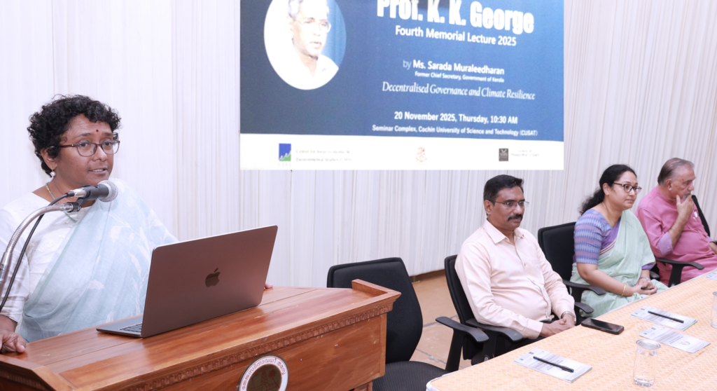 Ms. Sarada Muraleedharan, Former Chief Secretary, Government of Kerala, delivered the lecture on “Decentralised Governance and Climate Resilience”. Prof. K K George was a visionary researcher, teacher and guide in Kerala’s development, said Ms. Sarada Muraleedharan in her tribute.