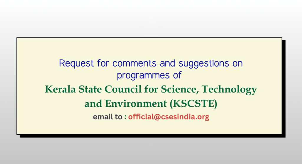 Now KSCSTE has decided to conduct an independent assessment of various programmes of the Council Headquarters. The study was entrusted to the Centre for Socio-economic and Environmental Studies (CSES), Kochi. The study is primarily based on the feedback of the stakeholders. In this connection, we request the feedback, opinions and suggestions from different sections of the Kerala population.